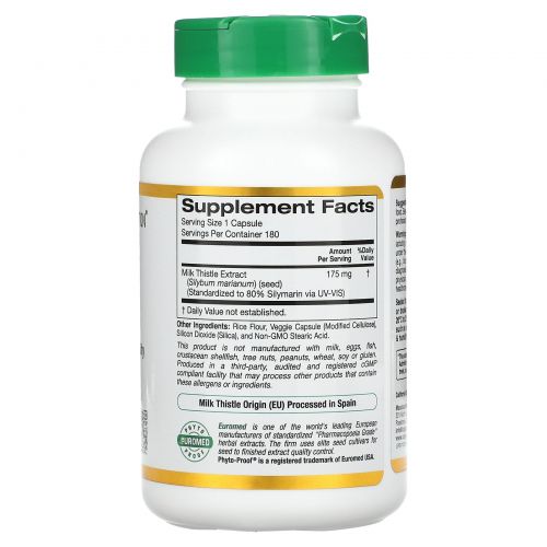 Описание товара California Gold Nutrition, Экстракт расторопши, 80% силимарина, EuroHerbs, клиническая эффективность, 180 вегетарианских капсул