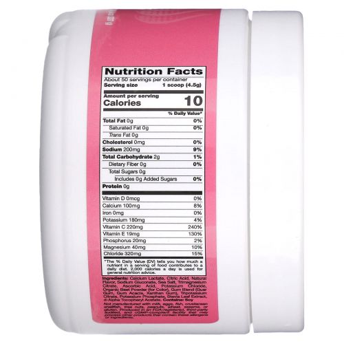 Лактат кальция, лимонная кислота, натуральный ароматизатор, глюконат натрия, морская соль, цитрат тримагния, аскорбиновая кислота, хлорид калия, порошок из сока органической свеклы (краситель), смесь камеди (гуаровая камедь, аравийская камедь, ксантановая камедь), цитрат калия 3-замещенный, фосфат калия, экстракт листьев стевии, d-альфа токоферилацетат.