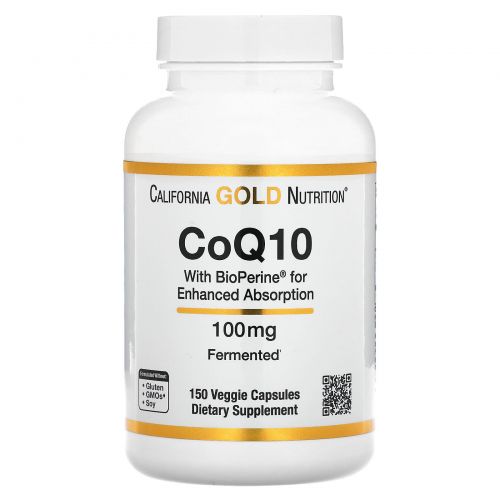 Описание товара California Gold Nutrition, Коэнзим Q10 фармацевтической степени чистоты с экстрактом Bioperine, 100 мг, 150 растительных капсул