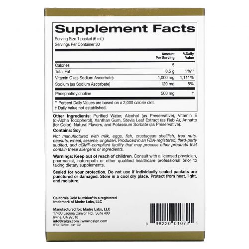 Описание товара California Gold Nutrition, Liposomal Vitamin C, Natural Orange Flavor, 1000 mg, 30 Packets, 0.2 oz (5.7 ml) Each