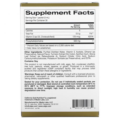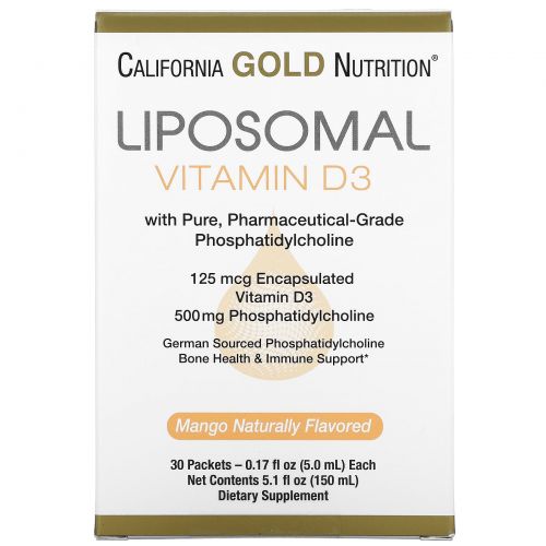 Описание товара California Gold Nutrition, липосомальный витамин D3, 125 мкг (5000 МЕ), 30 пакетиков по 5 мл