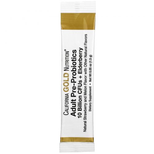 California Gold Nutrition, пребиотики и пробиотики для взрослых, 10 млрд. КОЕ + бузина, натуральный клубнично-дынный вкус, 30 пакетиков по 1,5 г (0,05 унции)