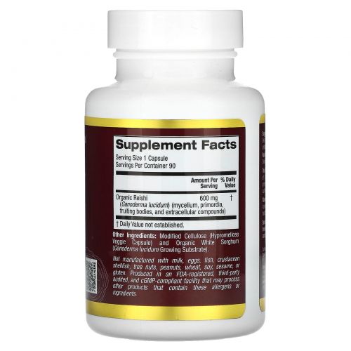 California Gold Nutrition, Рейши (Ganoderma Lucidum), грибы полного спектра, сертифицированный органический продукт, поддержка на клеточном уровне, 90 растительных капсул Plantcap
