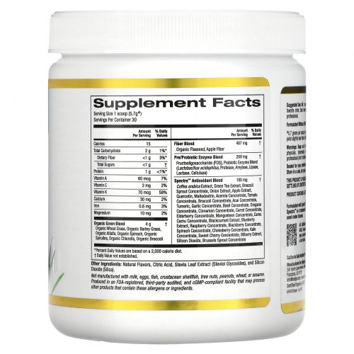 Комплекс антиоксидантов из суперзелени California Gold Nutrition Superfoods содержит восхитительное веганское сочетание зелени, клетчатки и пребиотиков/пробиотиков, а также антиоксидантную смесь фитонутриентов Spectra™.