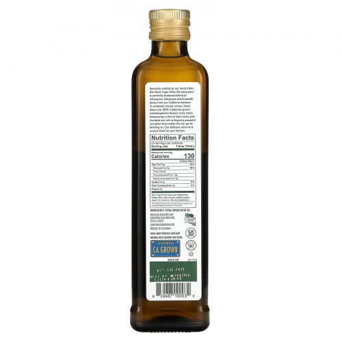 Это нерафинированное оливковое масло высшего качества, специально созданное нашим главным мельником, представляет собой идеально сбалансированную смесь оливок арбекина, арбосана и коронеика, выращенных нашими калифорнийскими фермерами. Неизменные обладатели наград, эти оливки на 100% выращены в Калифорнии и представляют смесь с фруктовыми нотками в сопровождении оттенка свежих трав и стойкого перечного вкуса, что делает это масло лучшим выбором для завершения ваших блюд. Наше вкусное оливковое масло просто необходимо на вашей кухне.