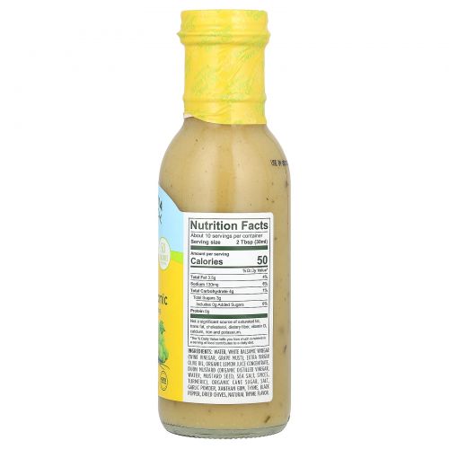 Вода, белый бальзамический уксус (винный уксус, виноградное сусло), оливковое масло холодного отжима, концентрат органического лимонного сока, дижонская горчица (органический дистиллированный уксус, вода, семена горчицы, морская соль, специи, куркума), органический тростниковый сахар, соль, чесночный порошок, ксантановая камедь, чабрец, черный перец, сушеный шнитт-лук, натуральный ароматизатор «Чабрец».
