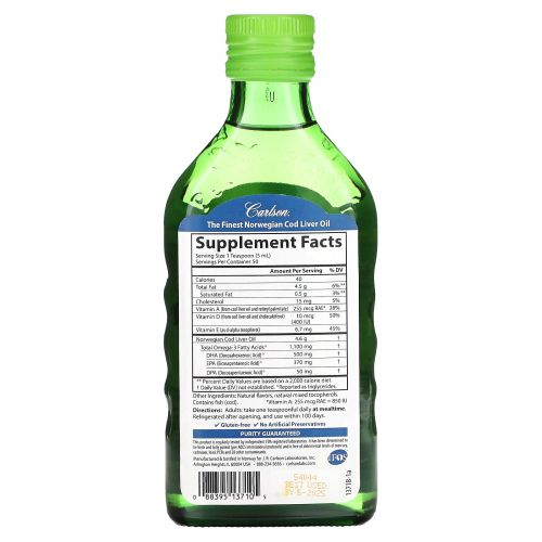 Описание товара Carlson, Cod Liver Oil, Natural Green Apple , 1,100 mg, 8.4 fl oz (250 ml)