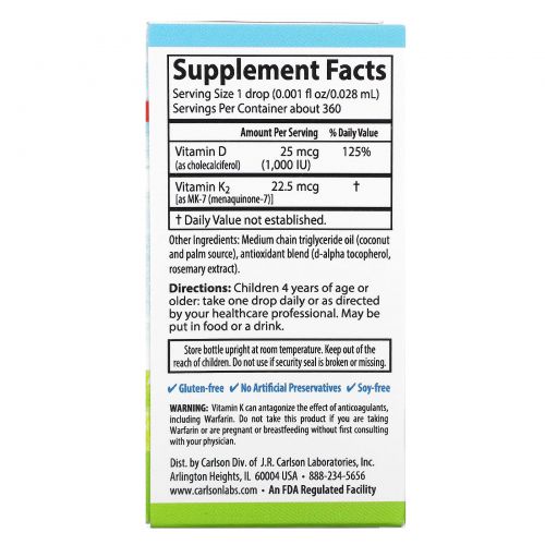 Описание товара Carlson Labs, Для детей, Super Daily D3+K2, 25 мкг, 0,34 ж. унц. (10,16 мл)