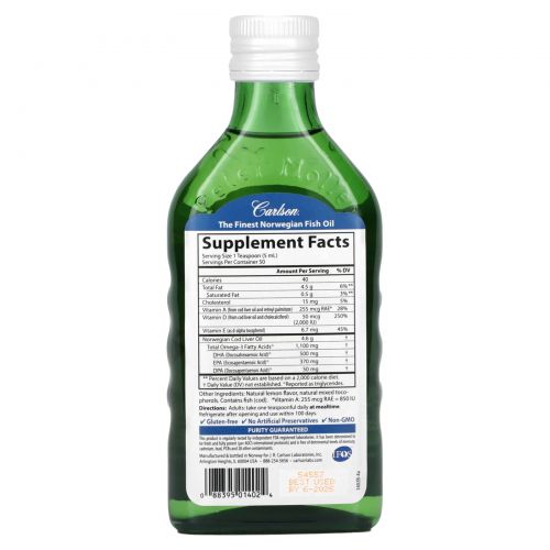 Описание товара Carlson Labs, Норвежский рыбий жир с витамином D, омега-3 и лимонным ароматизатором, 8,4 мл унции (250 мл)