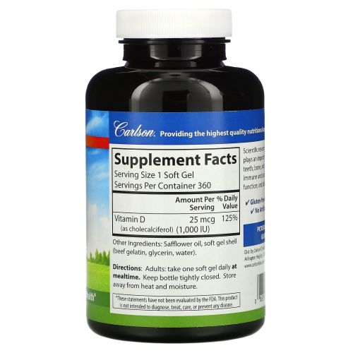 Описание товара Carlson Labs, Vitamin D3, 25 mcg (1,000 IU), 360 Soft Gels