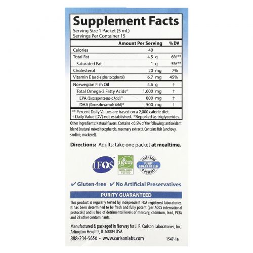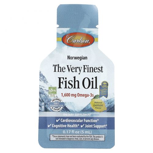 Описание товара Carlson, Norwegian The Very Finest, рыбий жир, натуральный лимон, 1600 мг, 15 пакетиков с жидкостью по 5 мл (0,17 жидк. Унции)