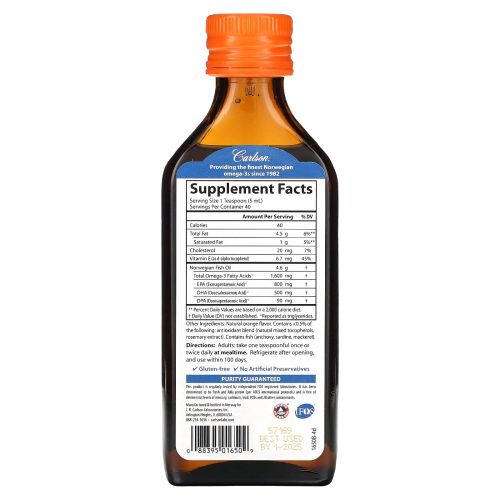 Описание товара Carlson, The Very Finest Fish Oil, натуральный апельсин, 200 мл (6,7 жидк. Унции)