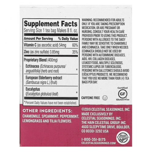 Описание товара Celestial Seasonings, Wellness Tea, Sleepytime, добавка для укрепления иммунитета с эхинацеей, без кофеина, 20 чайных пакетиков, 36 г (1,3 унции)