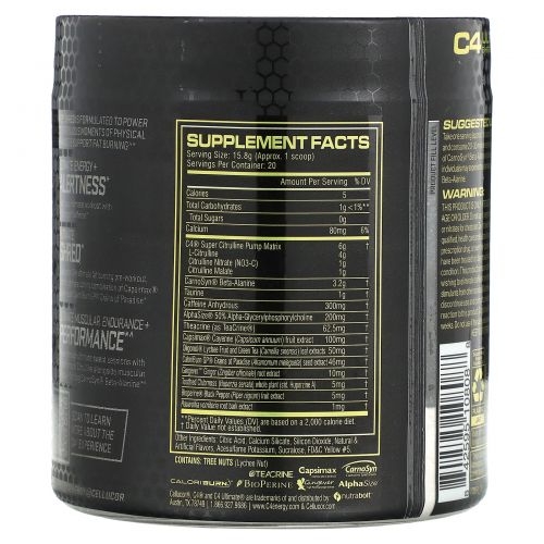 | C4® Ultimate Shred & Термогенная матрица N-ацетил-L-тирозин, безводный кофеин (300 мг), экстракт плодов DygloFit® (Dichrostachys glomerata), экстракт семян мукуны жгучей (Mucuna pruriens), экстракт плодов кайенского перца (Capsicum annuum) Capsimax®, экстракты плодов олигонола личи и зеленого чая Теакрин (в виде TeaCrine®), экстракт корня имбиря (Zingiber officinale) Gingever®, AlphaSize® A-GPC (альфа-глицерилфосфорилхолин), экстракт надземных частей Zembrin® (Sceletium teruosum), экстракт корня раувольфии (Rauwolfia vomitoria), гуперзин A (из зубатых Экстракт надземных частей мха (Huperzia serrata) | 1334 г | † |