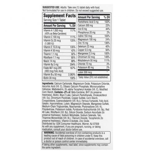 Карбонат кальция, оксид магния, хлорид калия, аскорбиновая кислота (витамин C), двузамещенный фосфат кальция, микрокристаллическая целлюлоза, мальтодекстрин, dl-альфа токоферилацетат (витамин E), модифицированный кукурузный крахмал. Содержит & amp; lt; 2% бета-каротина, бат (для сохранения свежести), биотин, краситель синий 2 лак, пантотенат кальция, холекальциферол (витамин d3), пиколинат хрома, сульфат меди, кукурузный крахмал, кросповидон, цианокобаламин (витамин B12), фумарат железа, фолиевая кислота, желатина, гипромеллоза, лютеин, стеарат магния, сульфат марганца, среднецепочечные триглицериды, никотинамид, фитонадион (витамин K), полидекстроза, йодид калия, пиридоксина гидрохлорид (витамин B6), краситель красный 40 лак, рибофлавин (витамин B2), диоксид кремния, аскорбат натрия (для сохранения свежести), молибдат натрия, селенат натрия, тальк, тиамина мононитрат (витамин B1), диоксид титана, токоферолы (для сохранения свежести), ацетат витамина A, оксид цинка.