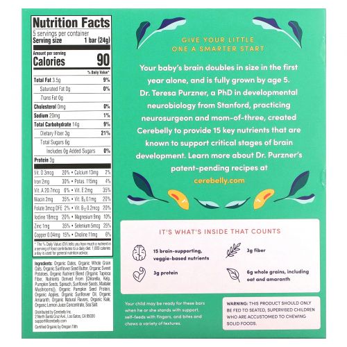 Описание товара Cerebelly, Smart Bars, Organic Toddler Bars, Apple Kale, 5 Bars, 0.84 oz (24 g) Each