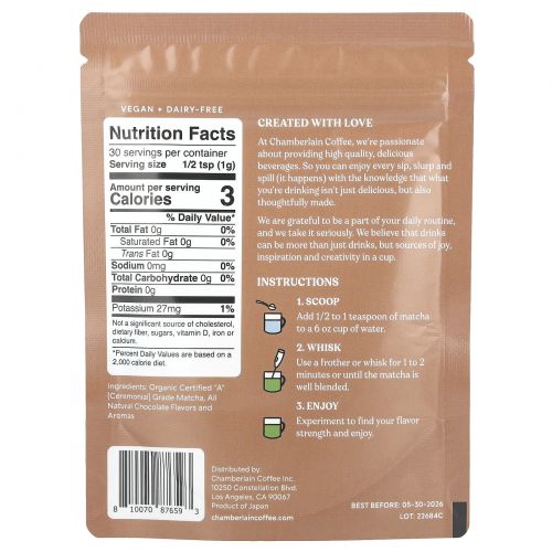 Описание товара Chamberlain Coffee, Шоколадный порошок матча, церемониальный, 30 г (1,06 унции)