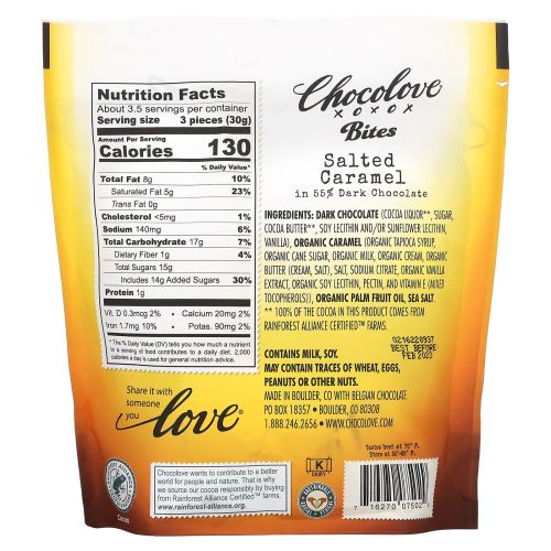 Описание товара Chocolove, Bites, Salted Caramel in 55% Dark Chocolate, 3.5 oz (100 g)