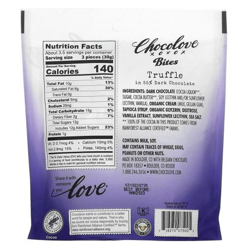 Описание товара Chocolove, Bites, Truffle in 55% Dark Chocolate, 3.5 oz (100 g)