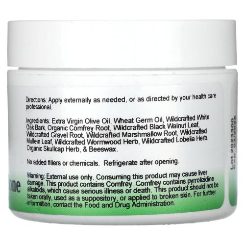 ПредупрежденияExternal use only. Consuming this product may cause Liver damage. This product contains Comfrey. Comfrey contains pyrrolizidine alkaloids, which may cause serious illness or death. This product should not be taken orally, used as a suppository, or applied to broken skin.