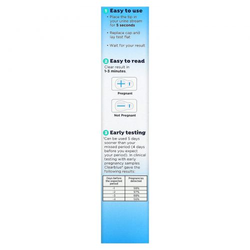 ¹Можно использовать на 5 дней раньше задержки менструации (за 4 дня до ожидаемой менструации). Во время клинических испытаний с образцами на ранних сроках беременности Clearblue® дал следующие результаты: