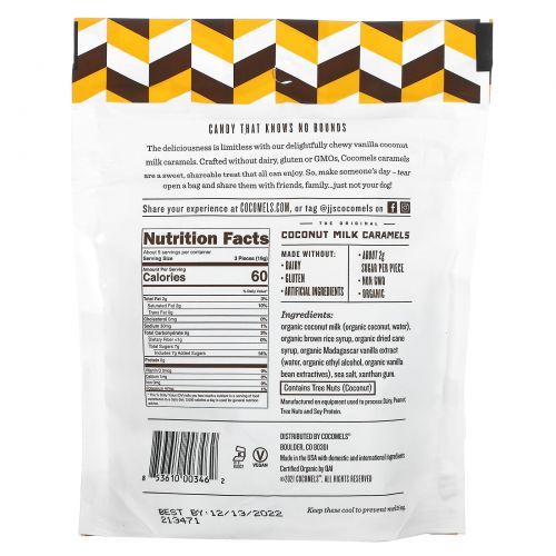 Вкусные блюда безграничны с нашей восхитительно жевательной карамелью с ванилью и кокосом. Карамель Cocomels не содержит молочных продуктов, глютена и ГМО. Итак, подарите кому-нибудь немного счастья — разорвите пакет и поделитесь содержимым с друзьями, семьей... только не со своей собакой!