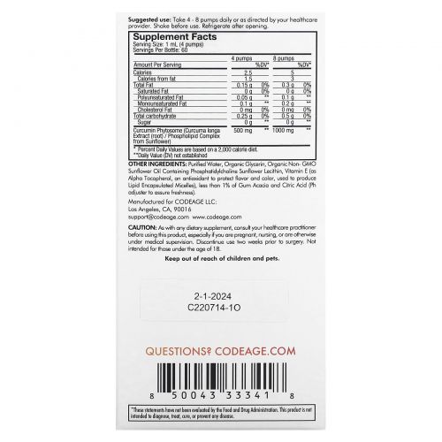 Описание товара Codeage, Curcumin Phytosome, цитрусовые, 1000 мг, 59,2 мл (2 жидк. Унции)