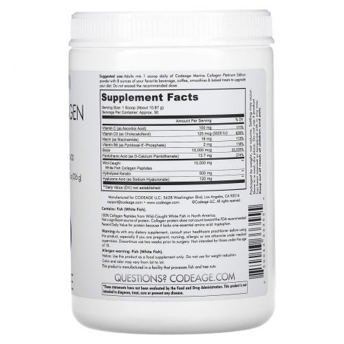 Описание товара Codeage, Platinum, пептиды морского коллагена, без добавок, 326 г (11,5 унции)