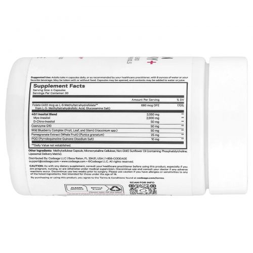 Добавка Codeage PQQ Ovarian Harmony + разработана для поддержки хорошего самочувствия женщин с помощью уникальной смеси мио-инозитола, D-хиро-инозитола, фолиевой кислоты в виде 5-MTHF, фитосомы CoQ10 и пирролохинолинхинона (PQQ). Эта формула, обогащенная экстрактами дикой голубики и граната, также имеет липосомальную доставку.