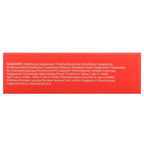 Другие ИнгредиентыДиметикон, изододекан, триметилсилоксисиликат, диметикон кроссполимер, диметикон/винил диметикон кроссполимер, дисилоксан, диизостеарил малат, полиглицерил-2 триизостеарат, бис-гидроксиэтоксипропил диметикон/IPDI сополимер этил карбамат, сорбитан изостеарат, полиглицерил-2 диизостеарат, дифенил силокси фенилтриметикон, краситель желтый 6 лак (CI 15985), краситель красный 7 лак (CI 15850), краситель желтый 5 лак (CI 19140), полигидроксистеариновая кислота, краситель красный 22 лак (CI 45380), этилгексил пальмитат, изопропил миристат, изостеариновая кислота, лецитин, полиглицерил-3-полирицинолеат, отдушка, дегидроуксусная кислота.