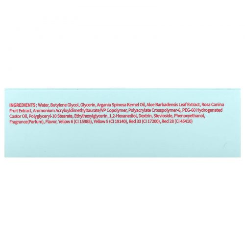 Другие ИнгредиентыВода, бутиленгликоль, глицерин, аргановое масло (Argania spinosa), экстракт листьев алоэ вера (Aloe barbadensis), экстракт плодов шиповника (Rosa canina), аммоний акрилоилдиметилтаурат/ВП сополимер, полиакрилата кроссполимер-6, ПЭГ-60 гидрогенизированное касторовое масло, полиглицерил-10 стеарат, этилгексилглицерин, 1,2-гександиол, декстрин, стевиозид, феноксиэтанол, отдушка, ароматизатор, краситель желтый 6 (CI 15985), краситель желтый 5 (CI 19140), краситель красный 33 (CI 17200), краситель красный 28 (CI 45410)