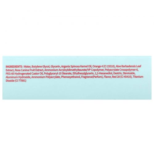 Другие ИнгредиентыВода, бутиленгликоль, глицерин, аргановое масло (Argania spinosa), краситель оранжевый 4 (CI 15510), экстракт листьев алоэ вера (Aloe barbadensis), экстракт плодов шиповника (Rosa canina), аммоний акрилоилдиметилтаурат/ВП сополимер, полиакрилата кроссполимер-6, ПЭГ-60 гидрогенизированное касторовое масло, полиглицерил-10 стеарат, этилгексилглицерин, 1,2-гександиол, декстрин, стевиозид, гидроксид алюминия, полиакрилат аммония, феноксиэтанол, отдушка, ароматизатор, краситель красный 28 (CI 45410), диоксид титана (CI 77891)