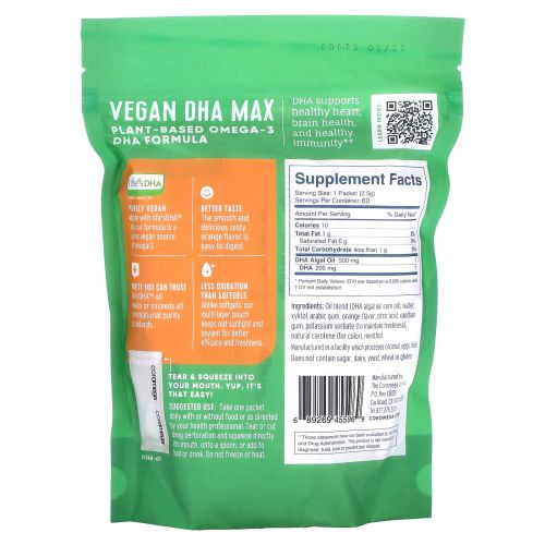 Coromega, Vegan DHA Max, апельсин, 60 индивидуальных пакетиков по 2,5 г