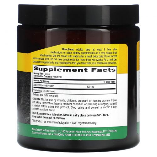Описание товара Country Life, Натуральный, Активированный уголь с кокосом в порошке, 500 мг, 5 унц. (141,7 г)