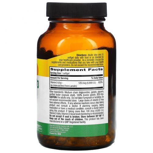 Описание товара Country Life, Витамин D3, 5000 МЕ, 200 желатиновых капсул