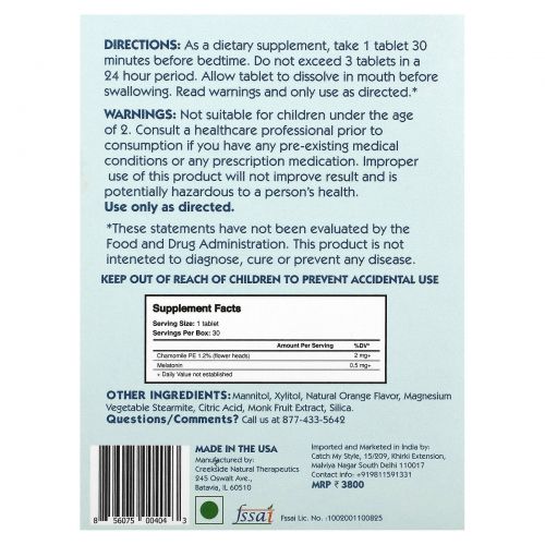Детское средство для сна Creekside Naturals может помочь вашему ребенку установить регулярный цикл сна, облегчая проблемы, вызванные плохим ночным сном. Эти восхитительные таблетки Orange Dream EZ-Melt созданы специально для детей и содержат мягкую смесь натуральных активных ингредиентов: Мелатонин (0,5 мг) и ромашка (2 мг). Детское средство для сна Creekside Naturals разработано педиатрами, безопасно и эффективно для детей в возрасте от 2 лет.