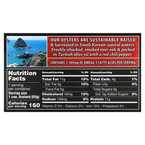Наши устрицы выращены и собраны экологически безопасным способом в прибрежных водах Южной Кореи. Свежие устрицы, которые после очистки прошли копчение дубовым дымом и были упакованы с добавлением турецкого оливкового масла и красного перца чили.