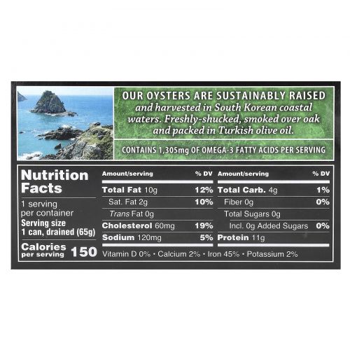 Наши устрицы выращены и собраны экологически безопасным способом в прибрежных водах Южной Кореи. Свежие устрицы, которые после очистки прошли копчение дубовым дымом и были помещены в консервные банки с турецким оливковым маслом.
