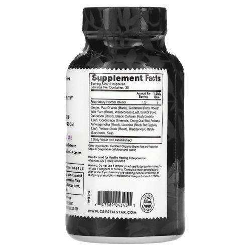 | Ginger, Pau D'arco (Bark), Goldenseal (Root), Mexican Wild Yam (Root), Watercress (Leaf), Burdock (Root), Dandelion (Root), Black Cohosh (Root), Dandelion (Leaf), Cordyceps Sinensis, Dong Quai (Root), Protease, Ashwagandha (Root), Licorice (Root), Red Raspberry (Leaf), Yellow Dock (Root), Bladderwrack, Maitake Mushrrom, Kelp | ||