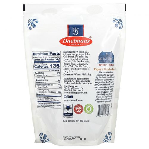 Знатоки просто без ума от настоящих голландских штрупвафелей, изготовленных в семейной пекарне Даэльманов (основано в 1909 году). Наслаждайтесь этими мягкими поджаренными вафлями и их характерной сладкой сливочно-карамельной начинкой прямо из коробки или согретыми над любимым горячим напитком.