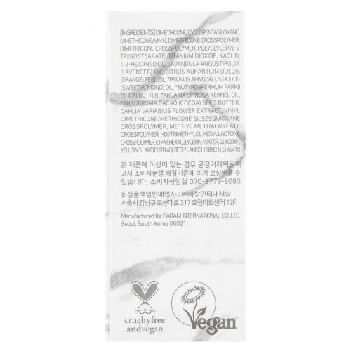 Другие Ингредиентыдиметикон, циклопентасилоксан, диметикон/винил диметикон кроссполимер, диметикон кроссполимер, полиглицерил-2 триизостеарат, диоксид титана, каолин, 1,2-гександиол, лавандовое масло (Lavandula angustifolia), масло из цедры апельсина (Citrus aurantium dulcis), масло сладкого миндаля (Prunus amygdalus dulcis), * Butyrospermum parkii s iea) масло, масло из косточек аргании (Argania spinosa), масло из семян какао (Theobroma), экстракт цветков георгина (Dahlia variabilis), винил диметикон/метикон силсесквиоксан кроссполимер, метил метакрилат кроссполимер, гександиизоцианат/триметилол хексиллактона кроссполимер, этилгексилглицерин, вода, глицерин, желтое 5 озеро (CI 19140), красное озеро 7 (CI 15850: 1), CI 45410