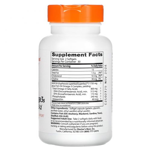 Криль от Doctor's Best содержит природные фосфолипиды и астаксантин. Кроме того, мы добавили к нему ДГК (докозагексаеновая кислота) и ЭПК (эйкозапентаеновая кислота) омега-3. Жизненно важные липиды являются строительными блоками для систем клеточной мембраны, которые управляют важными жизненными функциями всех наших органов. Согласно исследованиям, чем больше омега-3 содержится в рационе, тем здоровее становится сердце. ДГК является наиболее распространенной жирной кислотой в мозге человека. Высокий уровень ДГК и фосфолипидов помогает поддерживать работу сердца и мозга. Фосфолипиды в жирных кислотах омега-3 легко смешиваются с желудочными жидкостями и оказывают щадящее воздействие на желудок.