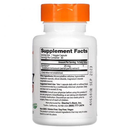 Описание товара Doctor's Best, Успокаивющий Зембрин, 25 мг, 60 Растительных капсул
