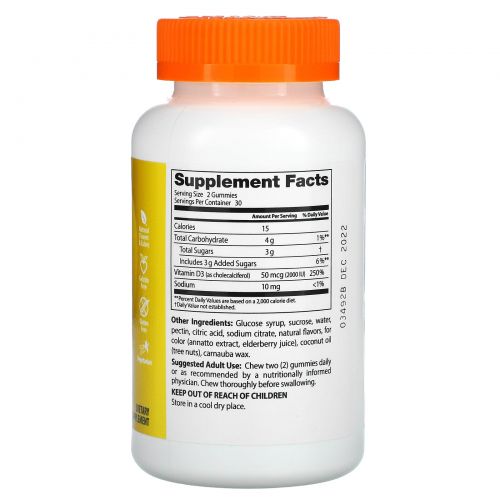 Описание товара Doctor's Best, Vitamin D3 Gummies, Tropical Tango, 50 mcg (2,000 IU), 60 Gummies