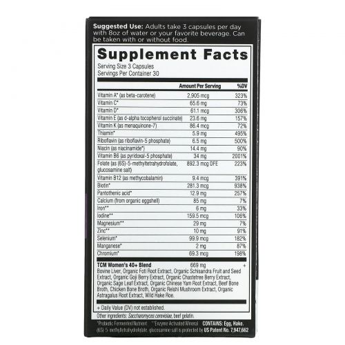 | Смесь для женщин старше 40 лет TCM Бычья печень, органический экстракт корня фоти, органический экстракт плодов и семян лимонника, органический экстракт ягод годжи, органический экстракт ягод годжи, органический экстракт листьев шалфея, органический экстракт корня китайского ямса, говяжий бульон, куриный костный бульон, органический экстракт грибов рейши Экстракт корня астрагала, икра дикого хека. | 669 мг | + |