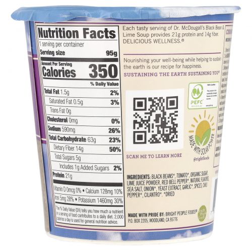 Доктор Черная фасоль McDougall's Right Foods® & Лайм - это восхитительный суп, который невероятно полезен. Каждая порция обеспечивает 54% суточной потребности в клетчатке и 21 г растительного белка для вашего Delicious Wellness.®