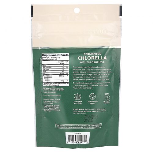 Каждая мерная ложка этого изумрудно-зеленого порошка ферментирована для легкого пищеварения и лучшего усвоения. Она содержит 50 мг поддерживающего здоровье хлорофилла из одноклеточной пресноводной водоросли Chlorella vulgaris, которая способствует нормальной работе системы детоксикации, укреплению иммунитета и здоровому старению клеток.