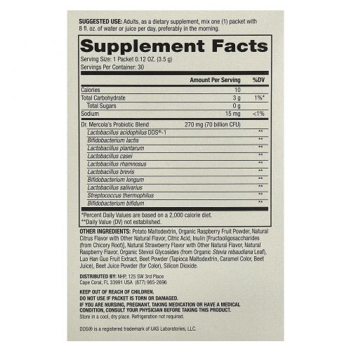 Описание товара Dr. Mercola, Лучшие добавки, пакетики с полноценными сухими пробиотиками, натуральный малиновый вкус, 30 пакетиков, по 0.12 унции(3.5 г) каждый
