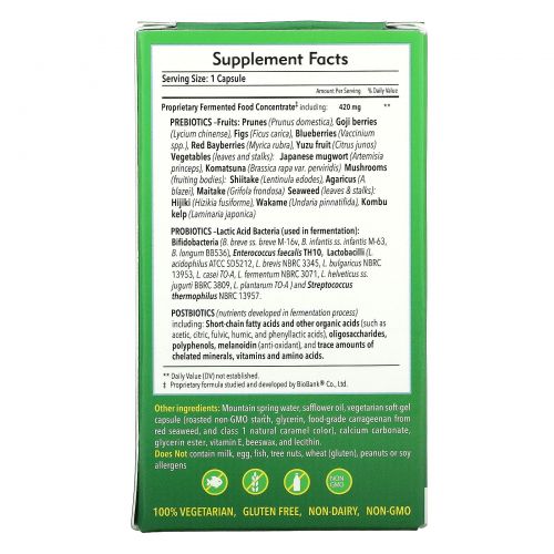 | Запатентованный ферментированный пищевой концентрат,‡ содержащий: пребиотики -— плоды чернослива (prunus domestica), ягоды годжи (lycium chinense), инжир (Ficus carica), черника (Vaccinium spp), Волковница красная (Myrica rubra), юдзу (citrus junos), овощи (листья и стебли): полынь японская (artemisia princeps), комацуна (Brassica rapa var. perviridis), грибы (плодоносящие тела): шиитаке (Lentinula edodes), шампиньон (A. blazei), гриб-баран (Grifola frondosa) морская капуста (листья и стебли): хидзики (Hizikia fusiforme), вакаме (Undaria pinnatifida), водоросль комбу (Laminaria japonica). | 420 мг | ** |
