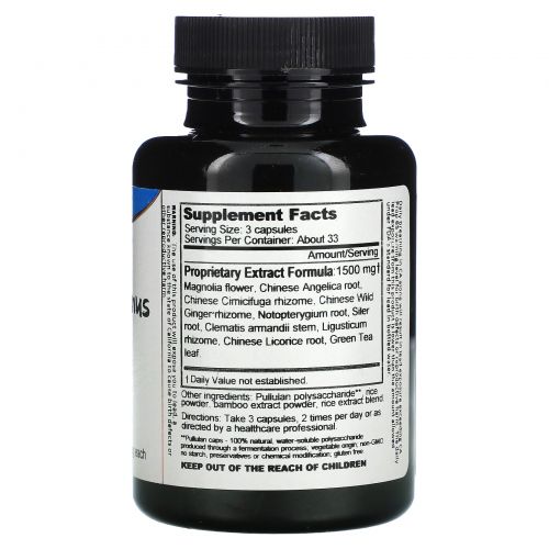 | Собственная формула экстракта: Цветок магнолии, Ароматный корень Анжелики, корневище китайского цимицифуги, китайский дикий завод имбиря, корень нотоптеригиума, корень силе, стебель Акейба, корневище Ligusticum chuanxiong, китайский корень солодки, лист зеленого чая. | 500 мг | † |